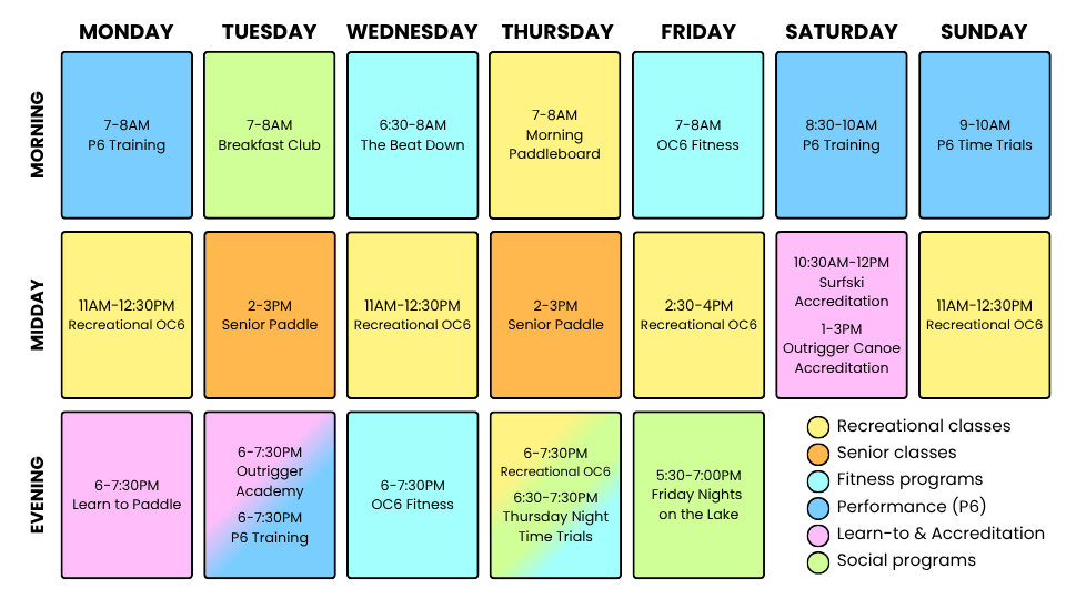 We offer a range of fitness classes for different types of paddling. These classes are designed to improve or maintain your speed, stamina, and strength. Options include: